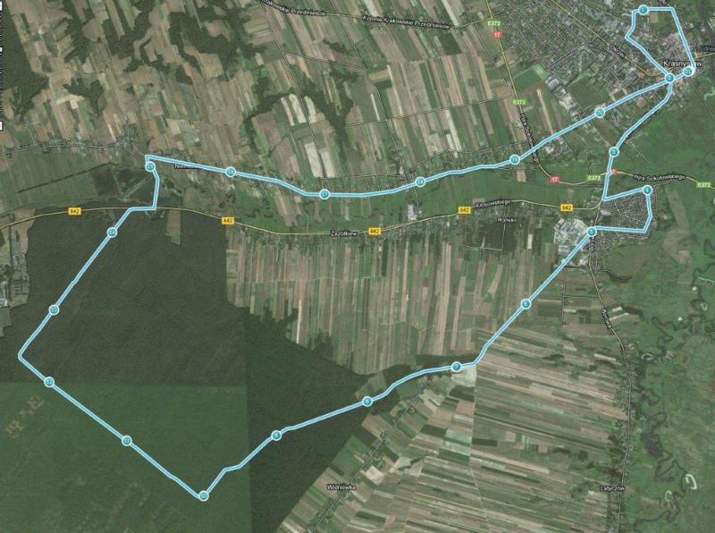 PRZEBIEG TRASY: Plac 3 Maja, ul. Kościuszki, ul. Kilińskiego, ul. Szkolna, ul. Sikorskiego, rondo na drodze krajowej nr 17, droga wojewódzka nr 842, ul. Czechowicza, ul. Wysockiej, ul. Borowa, ul. Krasickiego, droga wewnętrzna leśna Leśnictwo Namule, droga wojewódzka 842, droga gminna 109738L, Niemienice, ul. Krakowskie Przedmieście, ul. Piłsudskiego, Plac 3 Maja.