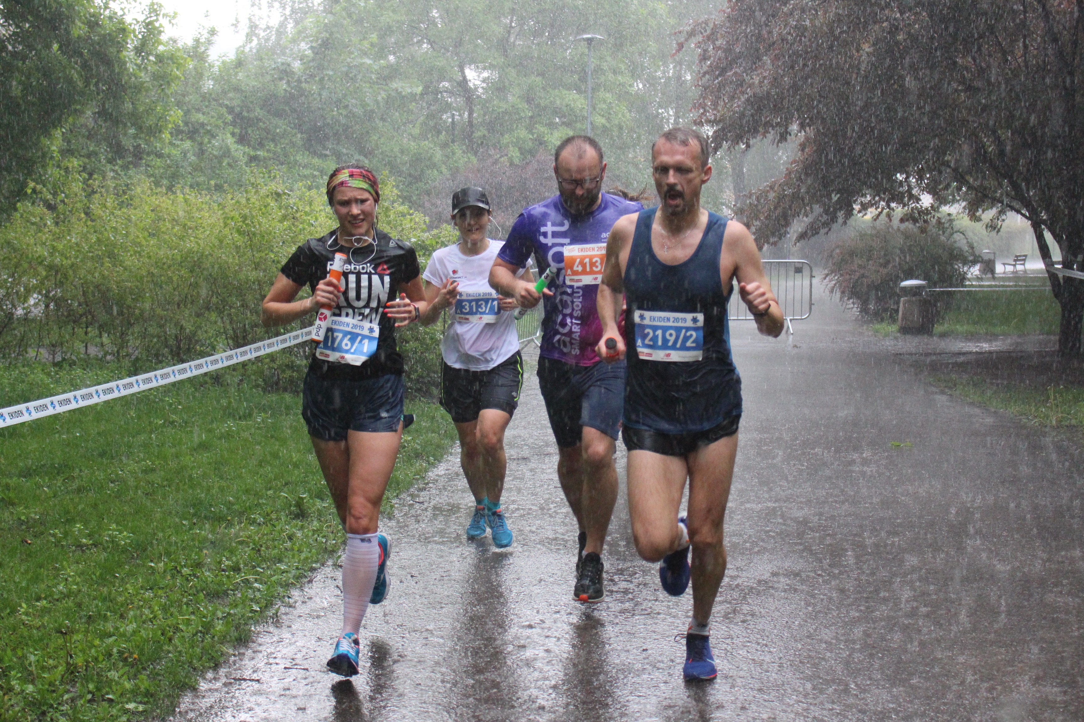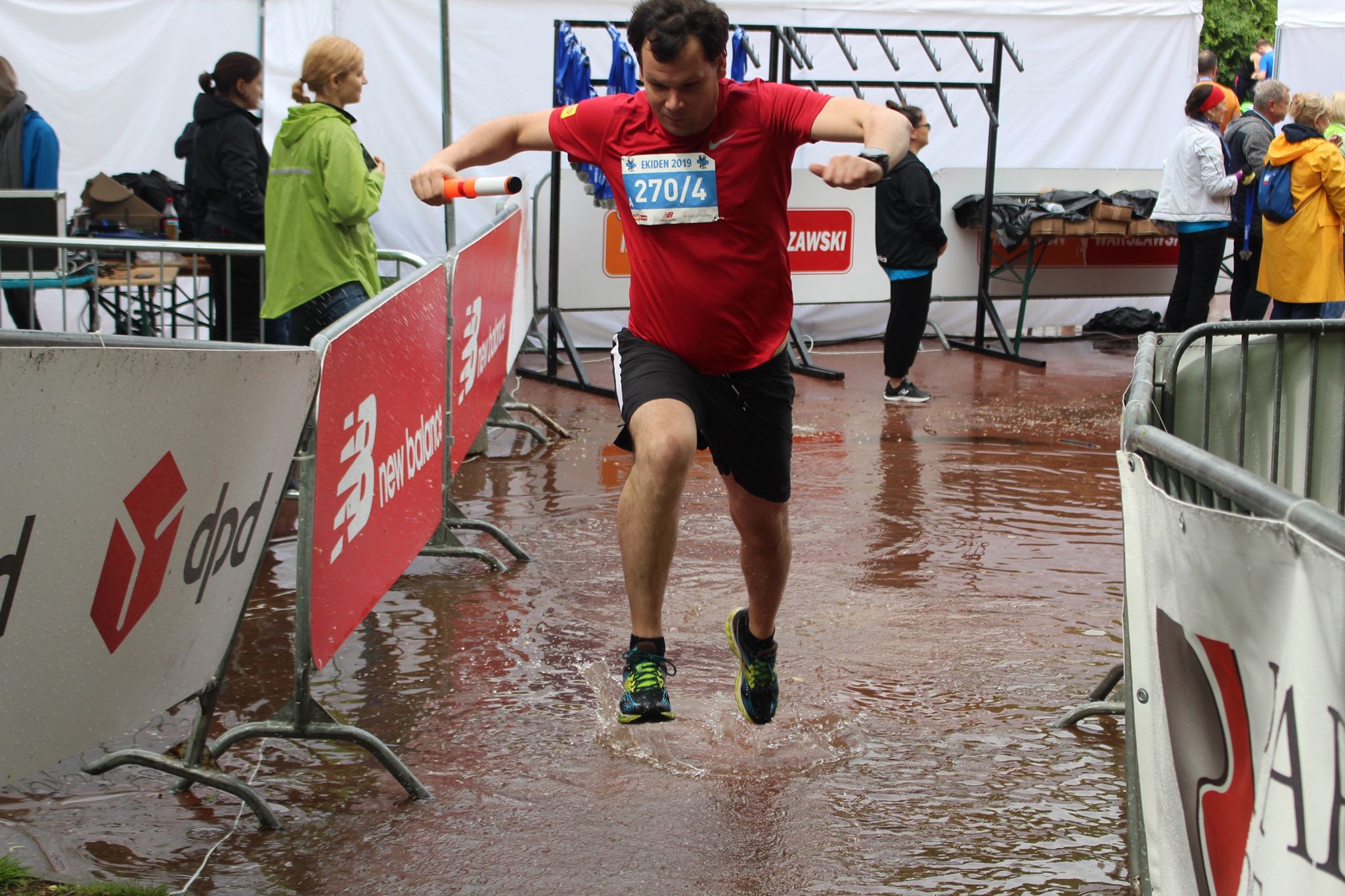 Biegaczom przyszło rywalizować w strugach deszczu i kluczyć między potężnymi kałużami. Już na dzień dobry, po przejęciu pałeczki czekał „rów z wodą”. Wszystko to sprawka ulewy, kran w godzinach porannych przeszła nad stolicą. Gdyby startował tu Krystian Zalewski, może przeskoczyłby powstałe jezioro. Takiego rozwiązania też próbowano, ale w większości zawodnicy musieli przebiec przez sam środek, by nie tracić cennych sekund.
