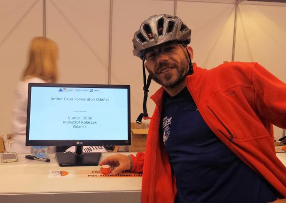 W piątek przed imprezą dowiedziałem się, że kolega, z którym się spotkałem na Festiwalu Biegowym też przyjedzie na półmaraton. A dojazd do hali po pakiet startowy dla kogoś, kto nie zna miasta, jest trochę utrudniony - autobus bezpośredni jeździ tylko w dni pracujące. Zaproponowałem, że odbiorę pakiet w zastępstwie. Tak też zrobiliśmy. Spotkaliśmy się na starcie. Meta, odbiór pakietów i całą bazę imprezy zorganizowano w wielkiej hali Amber Expo, podzielonej na 3 części, co jest jej wielka zaletą - potrafi pomieścić praktycznie wszystkich pod dachem i bez względu na warunki atmosferyczne można tam przyjemnie spędzić czas przed i po biegu.