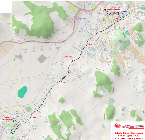 Atestowana trasa biegu na 10 km poprowadzi z Placu Ratuszowego, przez al. Wojska Polskiego i ul. Wolności do Parku Zdrojowego na Plac Piastowski w Cieplicach.