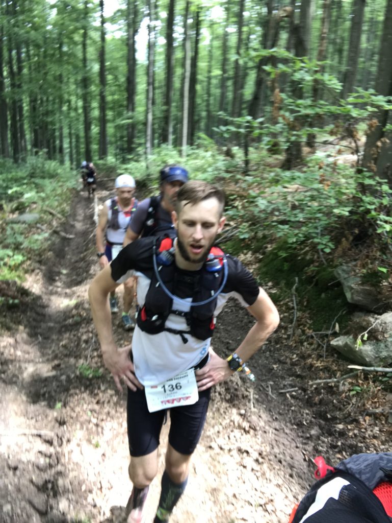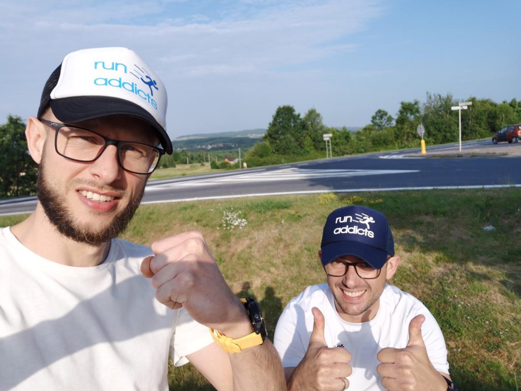 Chcieliśmy wykorzystać możliwość posiadania dodatkowej opcji nawodnienia w postaci bukłaka na plecach, poza softflaskami dostępnymi w kieszonkach i zdecydowaliśmy się na plecak Kalenji. Oba plecaki miały możliwość zamocowania do nich kijków NW. No właśnie, kije… My w tym roku nie używaliśmy kijków bo nigdy z nimi nie biegaliśmy. Wiemy z obserwacji, że wielu ich na trasie używała. Mamy zamiar popróbować jak będzie się z nimi nam wbiegało i zbiegało z naszego Myślęcińskiego stoku, a nóż widelec za rok czy dwa z nimi pobiegniemy? Ważny jest też dobór odpowiedniej, wygodnej koszulki – szczególnie mężczyźni na tak długiej trasie i zmiennych warunkach z racji braku stanika narażeni są na obtarcia – my korzystaliśmy z podesłanej wraz z plecakiem ultra lekkiej koszulki S/LAB SENSE TEE M, która waży zaledwie 40 gramów! Była niesamowita, wytrzymała całą trasę, idealnie odprowadzając nadmiar wilgoci – nawet podczas opadów deszczu, który towarzyszył nam na trasie czuliśmy że nadal jest lekka i szybko wysycha! Pamiętajcie też o odpowiednim okryciu głowy! Przy prażącym słońcu, będąc na dużym zmęczeniu znacznie łatwiej o udary, to bardzo ważny punkt wyposażenia, nie lekceważcie czapki/ buffki lub innej chusty, która odpowiednio zadba o zacienienie głowy. Łukasz biegł bez czapki i buffki, Paweł wykorzystał zakupioną w Decathlonie białą czapeczkę CZAPKA Z DASZKIEM KALENJI.