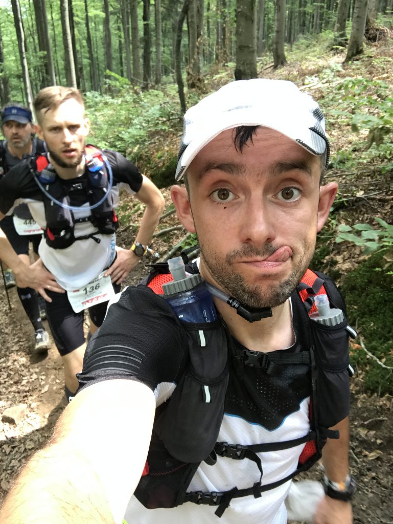 Chcieliśmy wykorzystać możliwość posiadania dodatkowej opcji nawodnienia w postaci bukłaka na plecach, poza softflaskami dostępnymi w kieszonkach i zdecydowaliśmy się na plecak Kalenji. Oba plecaki miały możliwość zamocowania do nich kijków NW. No właśnie, kije… My w tym roku nie używaliśmy kijków bo nigdy z nimi nie biegaliśmy. Wiemy z obserwacji, że wielu ich na trasie używała. Mamy zamiar popróbować jak będzie się z nimi nam wbiegało i zbiegało z naszego Myślęcińskiego stoku, a nóż widelec za rok czy dwa z nimi pobiegniemy? Ważny jest też dobór odpowiedniej, wygodnej koszulki – szczególnie mężczyźni na tak długiej trasie i zmiennych warunkach z racji braku stanika narażeni są na obtarcia – my korzystaliśmy z podesłanej wraz z plecakiem ultra lekkiej koszulki S/LAB SENSE TEE M, która waży zaledwie 40 gramów! Była niesamowita, wytrzymała całą trasę, idealnie odprowadzając nadmiar wilgoci – nawet podczas opadów deszczu, który towarzyszył nam na trasie czuliśmy że nadal jest lekka i szybko wysycha! Pamiętajcie też o odpowiednim okryciu głowy! Przy prażącym słońcu, będąc na dużym zmęczeniu znacznie łatwiej o udary, to bardzo ważny punkt wyposażenia, nie lekceważcie czapki/ buffki lub innej chusty, która odpowiednio zadba o zacienienie głowy. Łukasz biegł bez czapki i buffki, Paweł wykorzystał zakupioną w Decathlonie białą czapeczkę CZAPKA Z DASZKIEM KALENJI.