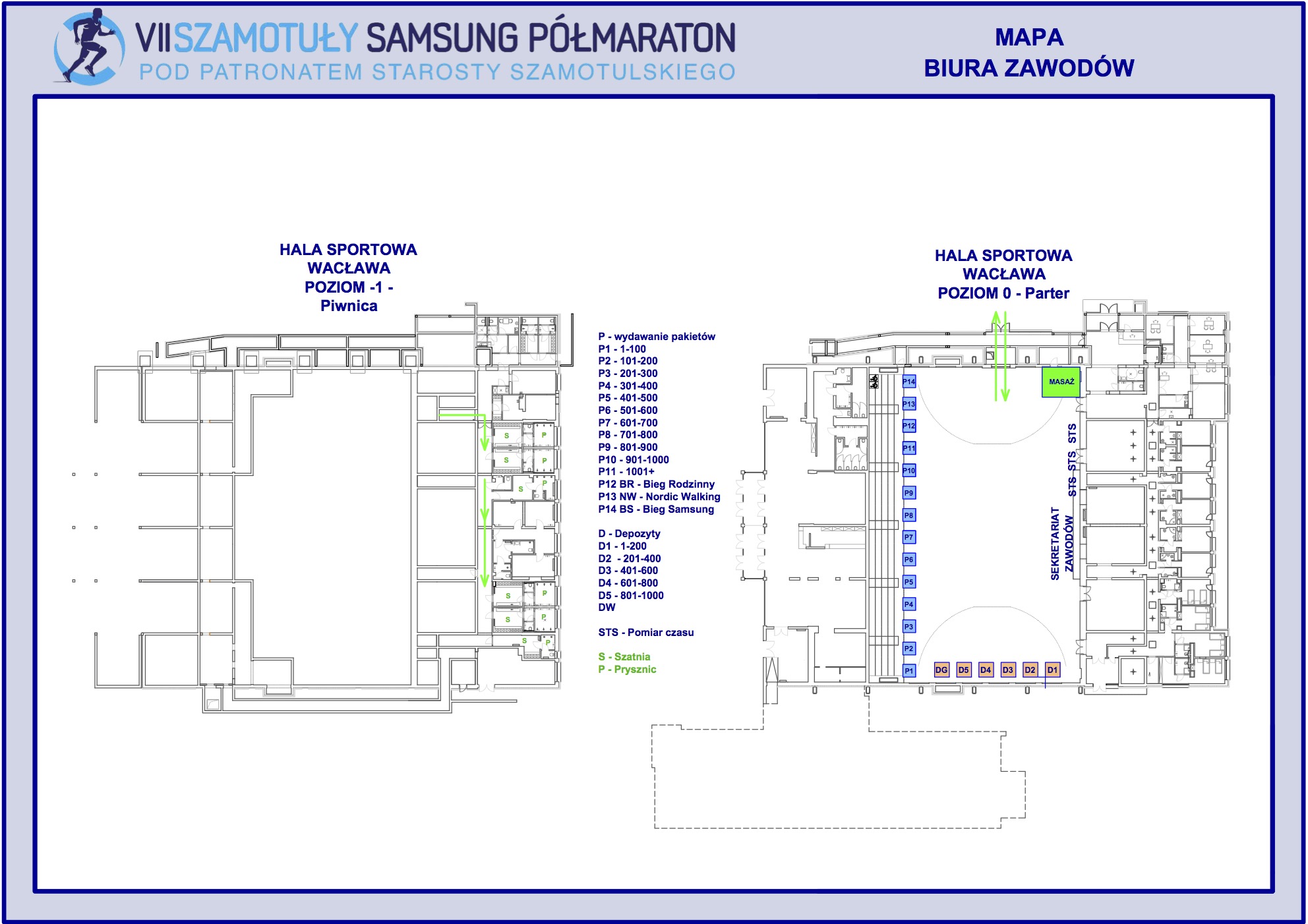Biuro zawodów znajduje się w hali Wacław przy ul. Sportowej 6 w Szamotułach. Godziny pracy Biura sobota 15:00-20:00, Niedziela 7:30-10:00 .Przebieralnie i prysznice znajdziecie w hali Wacław. Ze względu na niewypełnienie limitu opłaconych zgłoszeń Organizator umożliwi zakup pakietu w przeddzień półmaratonu tj. 7.10.2017 w godzinach otwarcia Biura Zawodów Zakupu pakietów w dniu 7.10.2017 będzie prowadzony do wyczerpania przygotowanych pakietów dodatkowych. Zakup pakietu w dniu półmaratonu tj. 8.10.2017 nie będzie możliwy ze względów organizacyjnych. Uczestników Marszu Nordic Walking oraz Biegu Rodzinnego prosimy o przybycie do wyznaczonych stref w okolicach startu na 20 minut przed zaplanowanym startem.