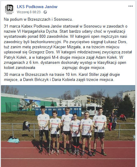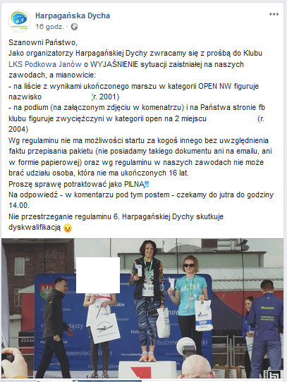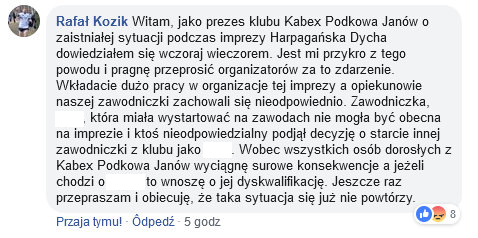 Pod postem organizatorów 6. Harpagańskiej Dychy, w którym wezwali klub KABEX Podkowa Janów do wyjaśnień, pojawiła się odpowiedź prezesa klubu Rafała Kozika. Twierdzi, że o całej sytuacji nie miał pojęcia i wyciągnie surowe konsekwencje wobec dorosłych członków klubu, którzy przyczynili się do oszustwa. Zawodniczka miała w ostatniej chwili zastąpić niedysponowaną koleżankę z drużyny.