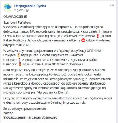 4.04.2019 Stowarzyszenie Harpagan Sosnowiec wydało oświadczenie, w którym poinformowało o dyskwalifikacji zawodniczki. Z tego powodu zmieniła się klasyfikacja open kobiet w marszu nordic walking. Cały klub KABEX Podkowa Janów otrzymał czerwoną kartkę na start w kolejnej edycji Harpagańskiej Dychy w 2020 roku. Zapowiedziano także bardziej szczegółową kontrolę podczas odbioru pakietów: " postawimy bardzo mocny nacisk: na bezwzględną konieczność posiadania dokumentu tożsamości ze zdjęciem oraz na szczegółową weryfikację z upoważnieniami (wraz z kserokopią dowodu osobistego) do odbioru pakietu startowego."
