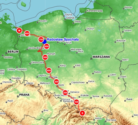 Postępy na trasie Radosława Spychały można śledzić TUTAJ (pozycja gps) oraz TUTAJ (fanpage facebook, na którym pojawiają się zdjęcia i nagrania wideo z kolejnych etapów).