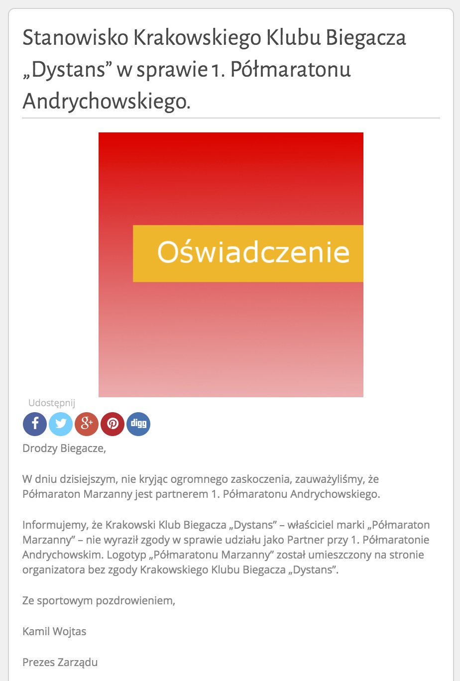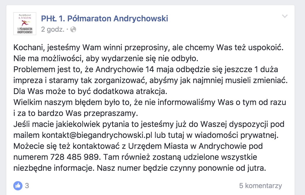 [AKTUALIZACJA 2] Organizator Półmaratonu Andrychowskiego przerywa ciszę