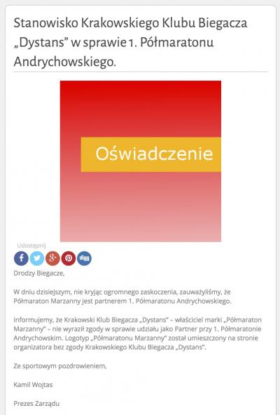 W międzyczasie oświadczenie nt. "współpracy" z Organizatorem imprezy w Andrychowie wydał KKB "Dystans"