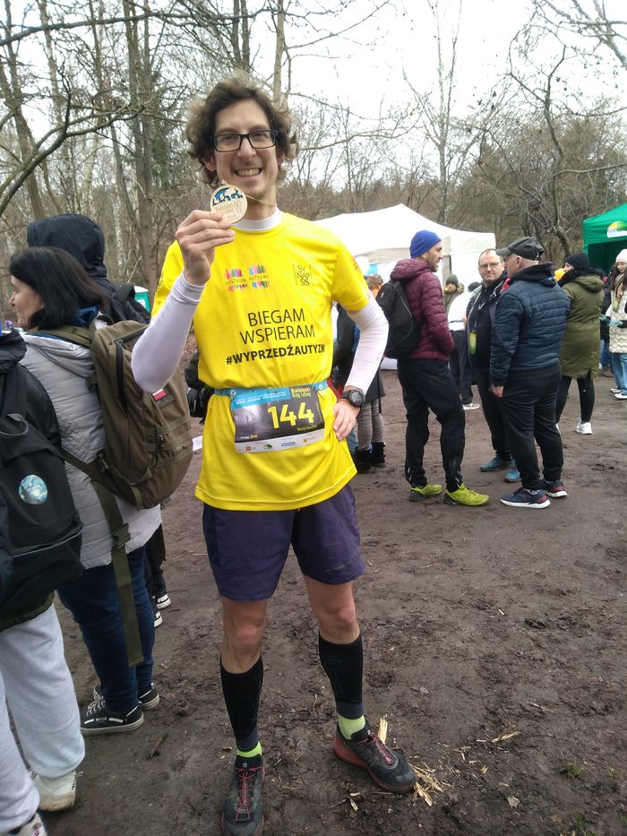 Start zaplanowano na godz. 10. Było zimno, 4 stopnie. Na szczęście nie padał deszcz tylko czasem drobna mżawka przez kilkanaście minut a potem znowu spokój. Mimo to ubrałem się na krótko. Tempo poniżej 5 potrafi rozgrzać. Tym bardziej, że były w tym lesie niezłe podbiegi. Po dwóch pętlach meta a tam jabłko, banan, drewniany medal, woda i zimna czekolada do picia. Trochę biednie ale tutaj liczył się dla mnie akcent charytatywny. Zresztą to tylko 5km.