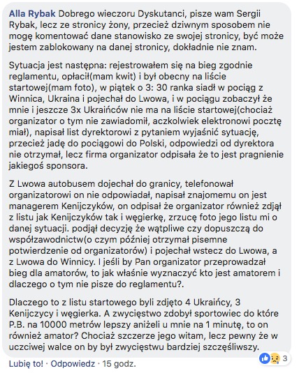 „Treść sportu i zamyka się w uczciwej walce, gdzie i zwyciężyć powinien silniejszy, a dyrektor biegu nawet nie daje szans na konkurencję i otwarcie propaguje dyskryminacyjne poglądy” - pisał dalej biegacz z Winnicy, oskarżając organizatorów o nieprzestrzeganie regulaminu i dyskryminację obocokrajowców.