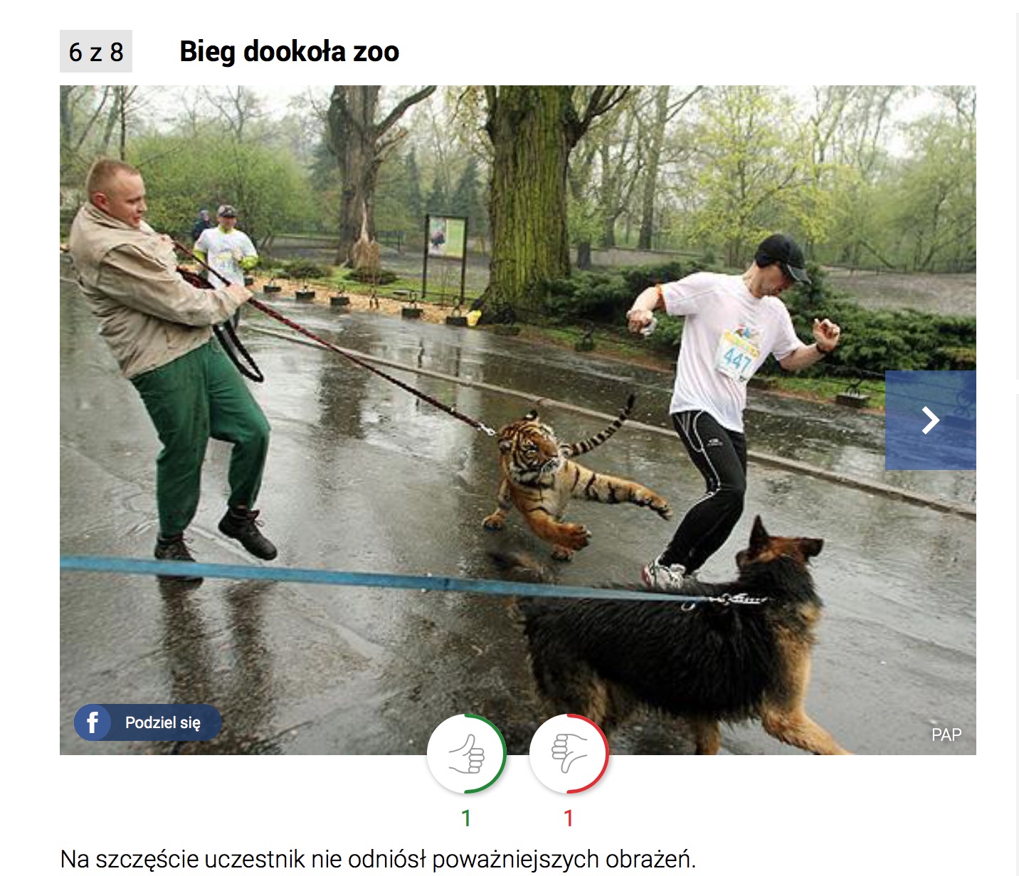 Pozostaje jeszcze kwestia tygrysicy sumatrzańskiej. Chociaż sprawa jest stara, na nowo rozpala emocje. Zoja, tygrysica wychowana przez ludzi, w 2009 r. była atrakcją biegu. Jednak jej udział w imprezie okazał się kontrowersyjny. Roczne wówczas, 57-kilogramowe zwierze miało w zwyczaju wychodzić na spacery, być prowadzone na smyczy przez swojego opiekuna i w towarzystwie psa, z którym na co dzień przebywała. Podczas biegu wyszła na taki właśnie spacer i zetknęła się z biegaczami, co utrwalił m.in. fotoreporter PAP (zdjęcie i komentarz za Wirtualną Polską):
