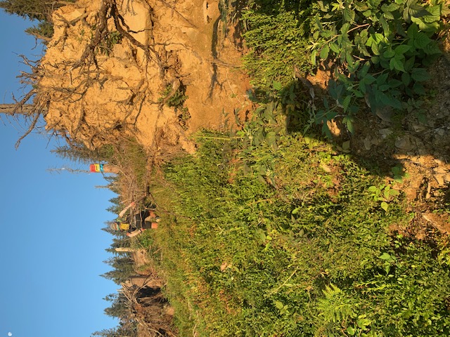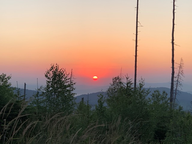 Przed nami kolejne podejście pasem granicznym od strony południowej. Brak osłony drzew i skrawka cienia daje się we znaki. Ścieżka częściowa przetarta co chwila mijamy słupki graniczne. Temperatura już ponad 30 stopni zwala z nóg. 6 km podejście wysysa wcześniej zgromadzone kalorie. Podejście podzielone na kolejne etapy do kolejnych linii horyzontu. Dalej nie widać upragnionego szczytu. Kolejne powalone drzewa na tracie i trawa po pachy nie ułatwia osiągnięcia celu.
