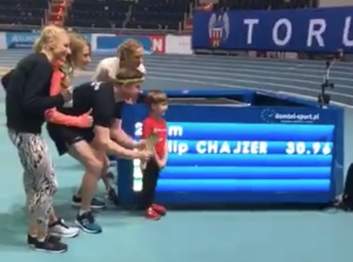 Pokonać jedno okrążenie bieżni Areny Toruń w 50 sekund - takie wyzwanie postanowiły rzucić Aniołki Matusińskiego ze złotej sztafety 4x400 m popularnemu prezenterowi Filipowi Chajzerowi. Dziennikarz podjął rękawicę, a próbę połączył z akcją charytatywną na rzecz chłopca dotkniętego nierównością kończyn dolnych.
