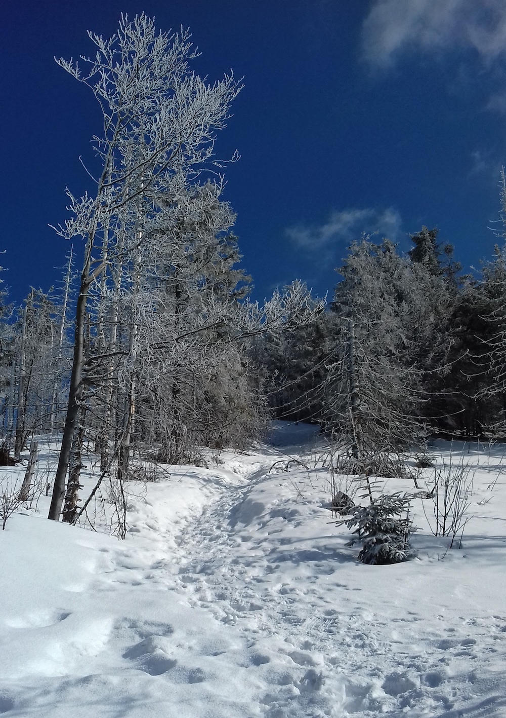 Po podbiegu kończy się asfalt a zaczyna czerwony szlak na Lubań. I śnieg. Początkowo twardy, zmrożony, można więc biec. Miejscami nogi nieco się zapadają, ale nie jest źle.