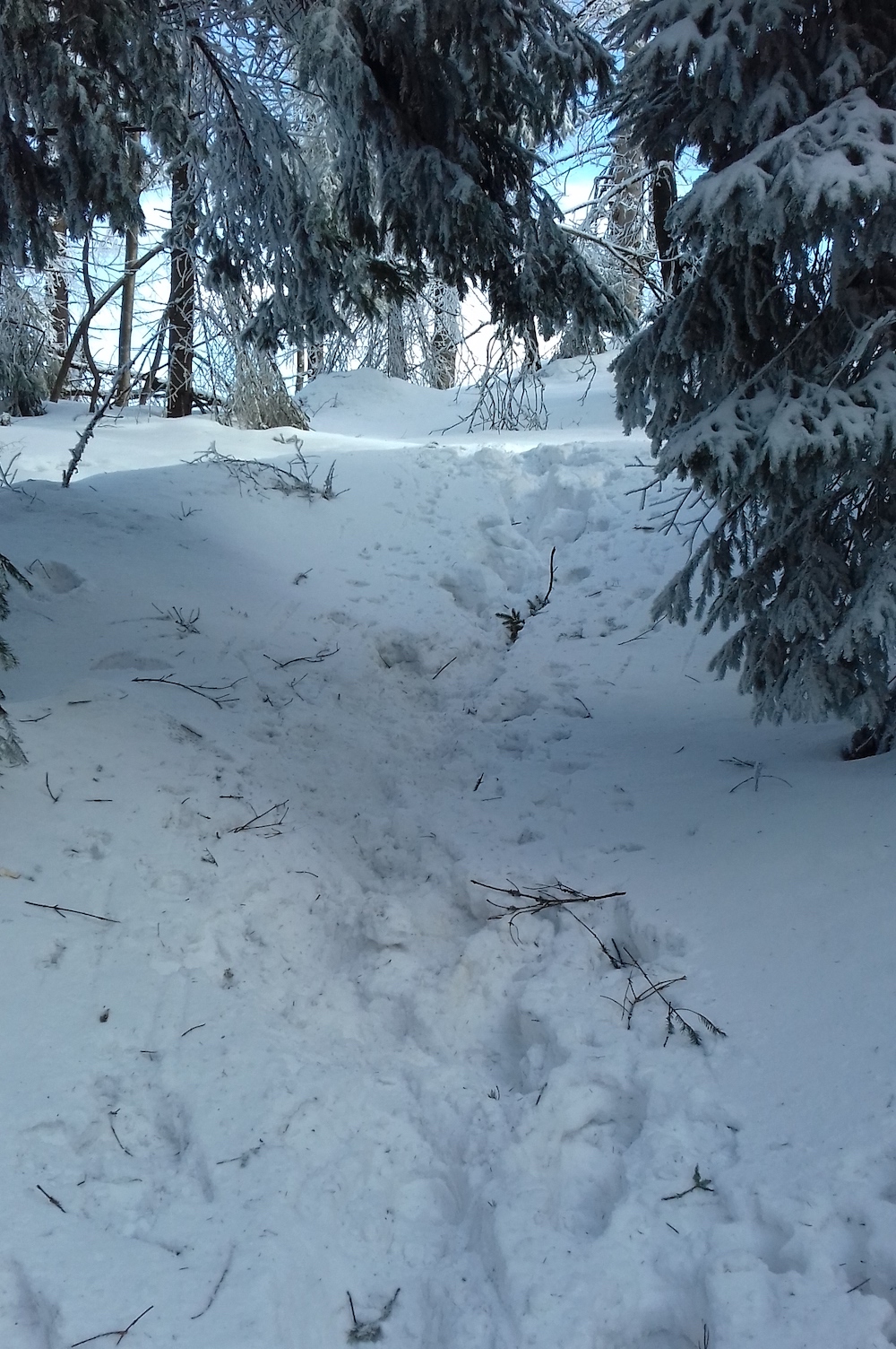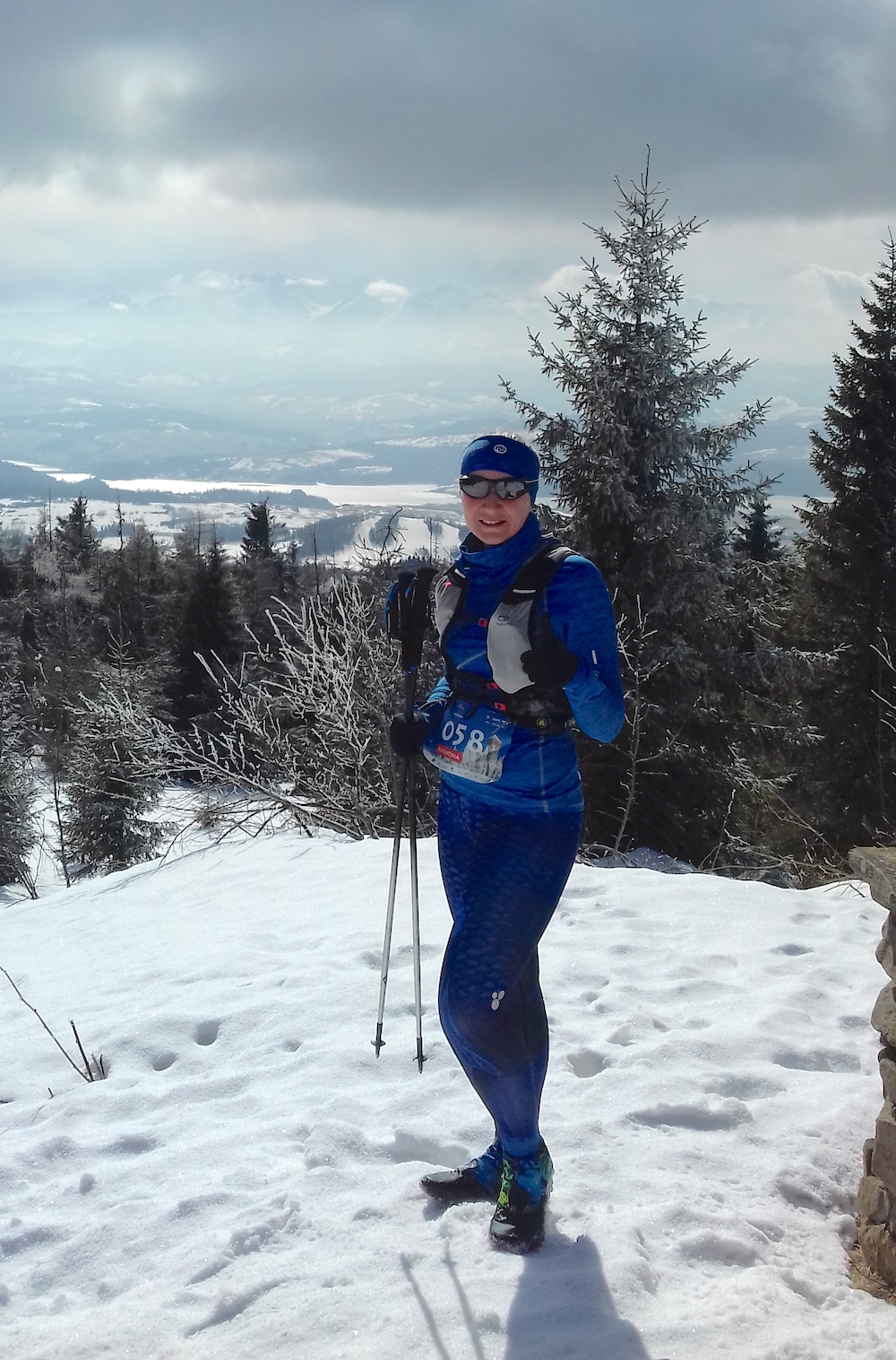 Po zejściu punkt kontrolny, pętelka wokół szczytu, zbieg żółtym szlakiem (pod górę wspinaliśmy się czerwonym, który jest krótszy i bardziej stromy). Wracamy tą samą drogą. No, prawie. Bo w tamtą stronę wydawało mi się, że biegniemy cały czas pod górę i z powrotem będzie z górki, tymczasem wciąż pokonuję kolejne wzniesienia. Biegnie się coraz trudniej – zrobiło się cieplej, śnieg zmiękł, momentami zmienił się breję, gdzie indziej nabrał konsystencji piasku, w którym zapadam się powyżej kostek. Od czasu do czasu wpadam po kolana, czasem głębiej. Miejscami można tylko iść, właściwie brnąć w śniegu.