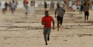 W zaaranżowanym na piaszczystej plaży biegu na „setkę”, aktor wystartował z 30-metrową przewagą nad ośmiokrotnym mistrzem olimpijskim. Hart uznał, że jest to sprawiedliwe rozwiązanie w pojedynku z emerytowanym, ale wciąż najszybszym biegaczem świata.