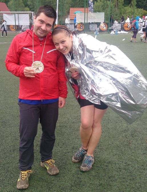 Tak jak się spodziewałem najbardziej dobił mnie zbieg do Cisnej. Kilka kilometrów drogi w dół. Moje „czwórki" to wytrzymały, ale ból był do czwartku. Na ostatnim kilometrze sporo kibiców a także Kuba Wiśniewski – zwycięzca Rzeźnika, mega sympatycznie. Fajnie było wbiec na metę, gdzie czekała na mnie Kinga. Zaraz potem dobiegła Aneta z bardzo dobrym czasem. Niestety rozpadał się deszcz. Po biegu losowanie nagród – poszczęściło się Anecie – wygrała książkę.