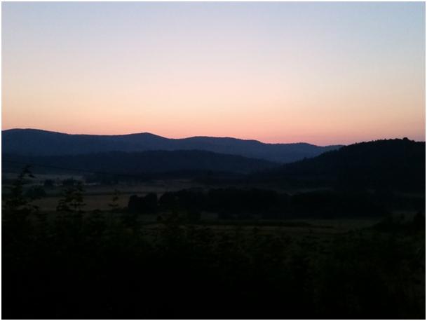 Trasa biegnie teraz w raczej płaskim, niewielkie wzniesienia, długie odcinki monotonnego krajobrazu. Wbiegamy do jakiejś małej miejscowości. Ok. 4. nad ranem. Biegniemy obok kościoła, później koło ‘mordowni’ – już daleka słychać muzykę. Na parkingu przed lokalem gość montuję system nagłaśniający do samochodu kumpla(?) który przygląda się temu tez emocji. No pewnie, emocje o tej godzinie! Lokal tętni życiem. I muzyką. I … Zostawmy to. Skręcam w bok od głównej drogi za szarfami. Znów biegnę prostym płaskim odcinkiem, który się dłuży i dłuży. Znowu las. Nikogo nie widać ani za mną ani przede mną. Wbiegając na wniesienie gdy las robi się rzadszy robię zdjęcie. Wkrótce świt. Jestem w rezerwacie przyrody Cisowa Góra.