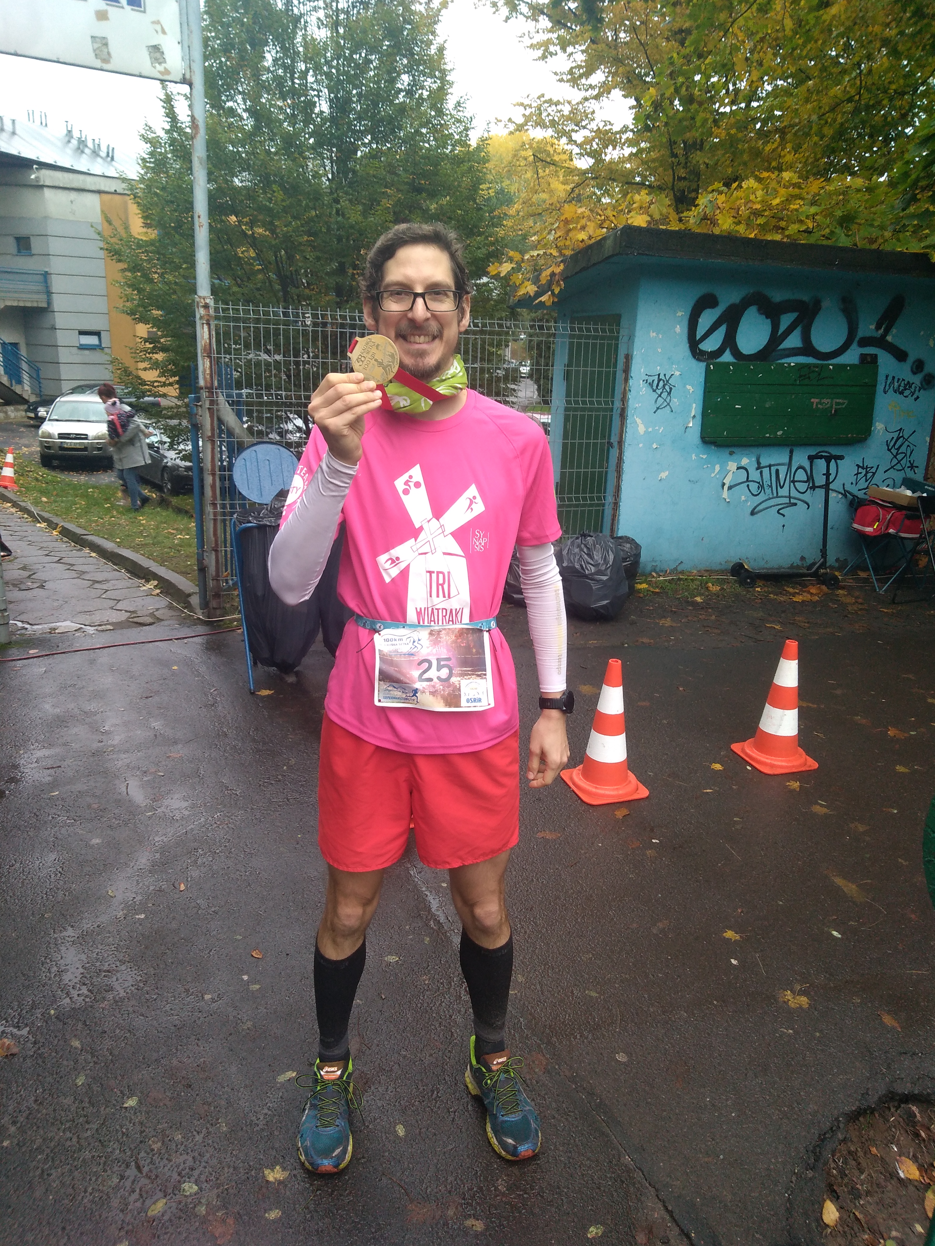 Start 6:30. Limit 12,5h. Tłok tylko na początku. Szeroka ścieżka asfaltowa na największego tira, także spokojnie wszyscy się pomieścili, tym bardziej, że uczestników było ok. 80 osób. Na starcie bufet, namiot gdzie można mieć swoje rzeczy, żywność, itp. Nie ma potrzeby biegania z plecakiem. Niektórzy mieli na pasie zieleni przy płocie nawet swoje strefy vip z krzesełkiem, jedzeniem itp. Trasa prowadzi wzdłuż rzeki Prosna przez 2,5km km a następnie powrót z lekkim zbiegiem i podbiegiem tunelem pod ulicą. Razem 5km. Nie do końca można zatem powiedzieć, że jest to pętla. 20 sztuk i jest 100km. Można też przebiec 50km i medal gwarantowany. Dlaczego zatem kilkadziesiąt osób męczy się co roku robiąc 2,5 maratonu? Z różnych powodów ale większość chce mieć zaliczoną koronę ultramaratonów polskich a te zawody są na liście. W tym roku było ciepło, deszczowo i słonecznie. Czyli dla każdego coś dobrego. W bufecie zabrakło mi pomarańczy ale miałem swoje mandarynki. Ogólnie bieg był ok z racji tego, że co 5 km był bufet. Nie trzeba było niczego dźwigać. Jednak ten asfalt...