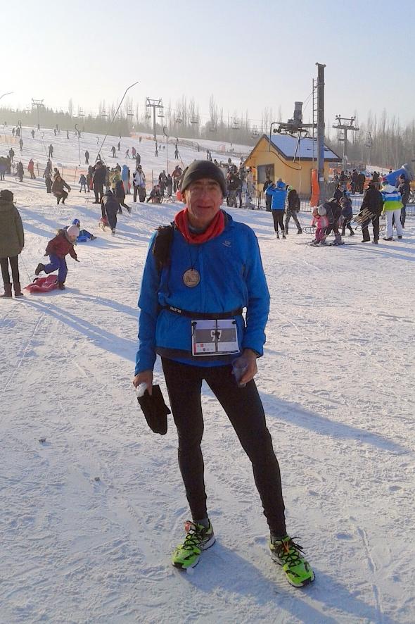 Gdy podejście się kończy, okrążamy z lewej strony górną stację wyciągu. Większość zawodników idzie, ja mam jeszcze wolę walki i biegnę. Pozostał jeszcze ostry zbieg w dół do mety tą samą trasą, co zbiegaliśmy rano. Zmuszam się do biegu, chociaż mięśnie nie chcą hamować na zbiegu. Znów wyprzedzam kilku biegaczy i ostrym zbiegiem wpadam na metę. Tam sprawdzenie wyposażenia obowiązkowego. Jest medal i herbata.