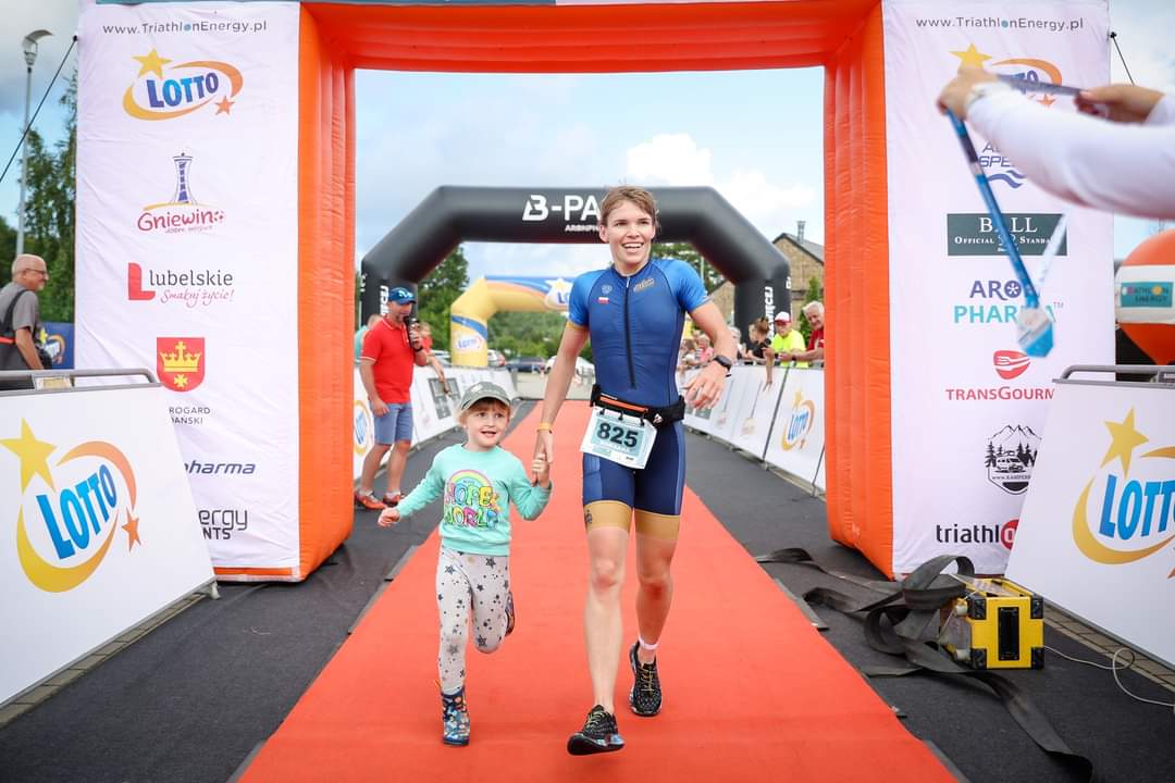 Odwiedziłam na miejsce, zdjęłam kask, ubrałam buty na bieg oraz numerek startowy. Jakie było moje zaskoczenie gdy mąż wołał że jestem TRZECIA! Trasa biegowa biegła asfaltem wzdłuż trasy rowerowej i nawrót po 2,5 km. Profil był raczej płaski. Do nawrotu trzymałam się za drugą zawodniczką. Natomiast po minięciu beczki postanowiłam ją wyprzedzić i utrzymałam drugą pozycję do mety.