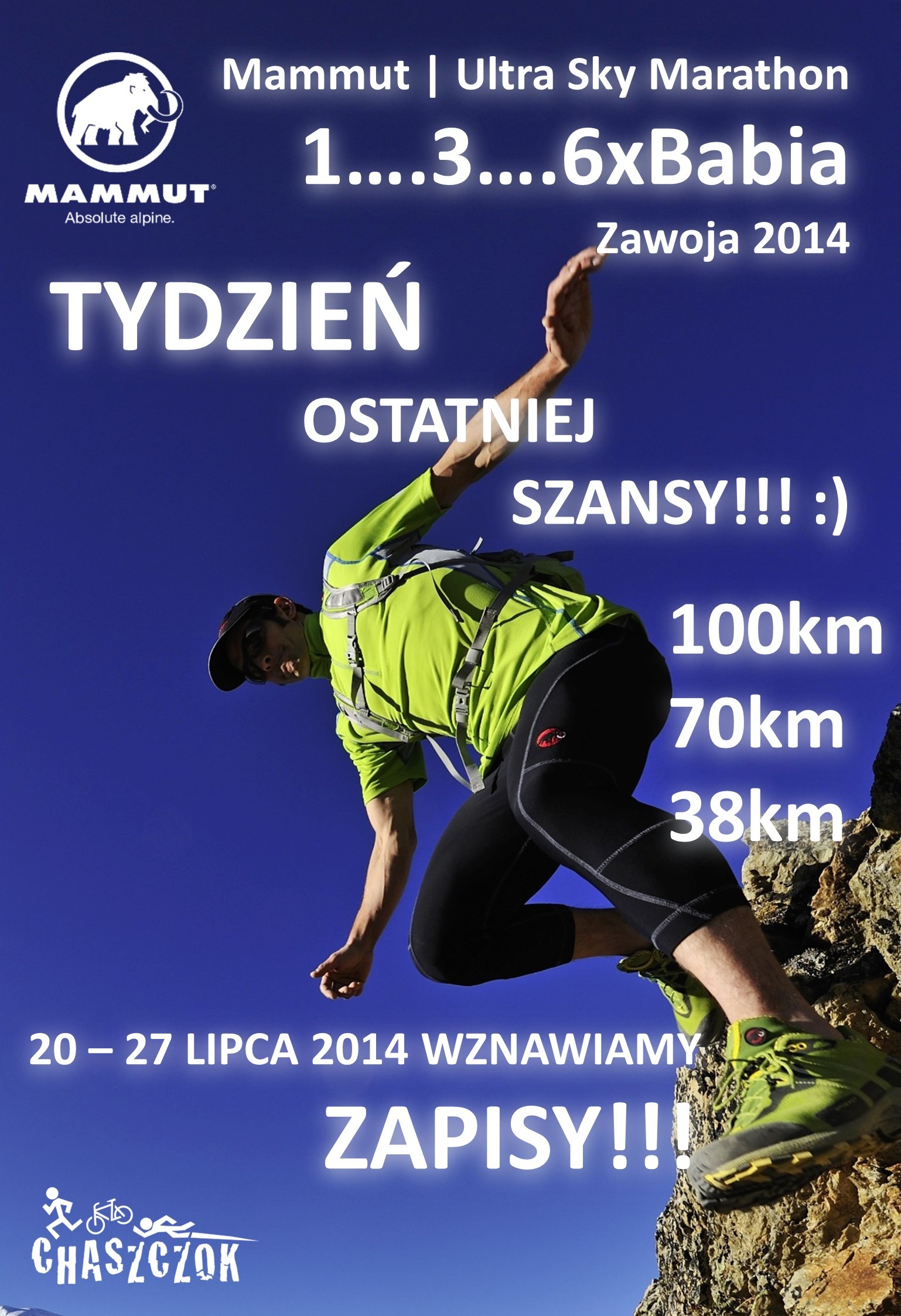 – Na prośbę zawodników wznawiamy zapisy do imprezie na wszystkich trzech dystansach. Zapisy wznowimy w niedzielę 20 lipca. Potrwają one dokładnie tydzień. To będzie ostatnia możliwość na zapisanie się do naszych biegów – informuje Paweł Racułt z biura organizacyjnego Mammut Ultra Sky Marathonu.