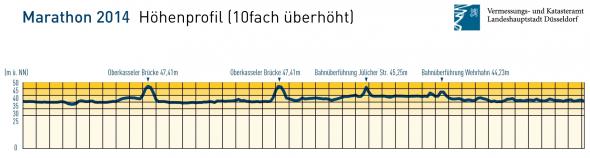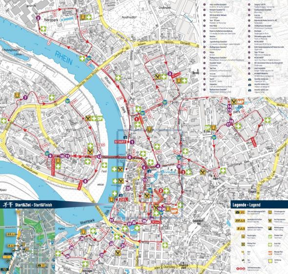 Bieg poprowadzono przez centrum miasta oraz bulwarami nad Renem. Trasę można zaliczyć atrakcyjnych. Trasa jest niemal płaska. Jej najwyższym punktem jest most Oberkasseler Brücke, który wznosi się na wysokość 47,41m n.p.m przy średniej wysokości trasy 40m n.p.m.. Podczas biegu trzeba go pokonać dwa razy.
