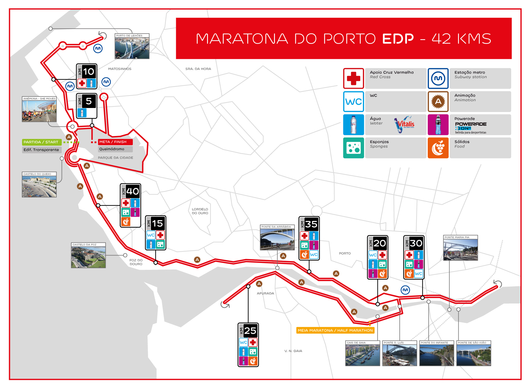 Start odbywa się na ogromnym placu Queimodromo koło największego w mieście parku Parque da Cidade. To miejce organizacji wielu plenerowych imprez i koncertów, bez problemu mieści więc tysiące startujących. Pierwsze kilometry to bieg wzdłuż wybrzeża Oceanu Atlantyckiego i powrót w okolice strefy startu. Stamtąd trasa wiedzie w stronę historycznego Porto, brzegiem rzeki. Można zobaczyć najstarszą część miasta, Ribeirę. Następnie zawodnicy przekraczają rzekę Duero słynnym mostem Ponte Dom Luís I. To mierząca prawie 400 metrów dwukondygnacyjna budowla. Na szczęście trasa prowadzi jej dolną częścią. Po drugiej stronie rzeki czekają legendarne winiarnie. To miasto Vila Nova de Gaia, prawdziwa ojczyzna wina porto. Trasa robi mierzącą 4,5 km agrafkę i mostem wraca do centrum Porto, skąd do mety pozostaje niecałe 10 km.