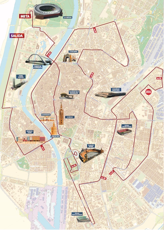 Start odbywa się na Avenida Carlos III a metę tradycyjnie ulokowano na stadionie Estadio de La Cartuja zwanym Stadionem Olimpijskim (Sewilla dwukrotnie starała się bezskutecznie o organizację igrzysk). Maratończycy mają okazję zwiedzić całe miasto, zarówno centrum, jak i jego obrzeża. Po drodze zobaczą największe zabytki miasta, takie jak: Plaza de España, Torre del Oro, La Giralda, Maria Luisa Park czy La Maestranza.