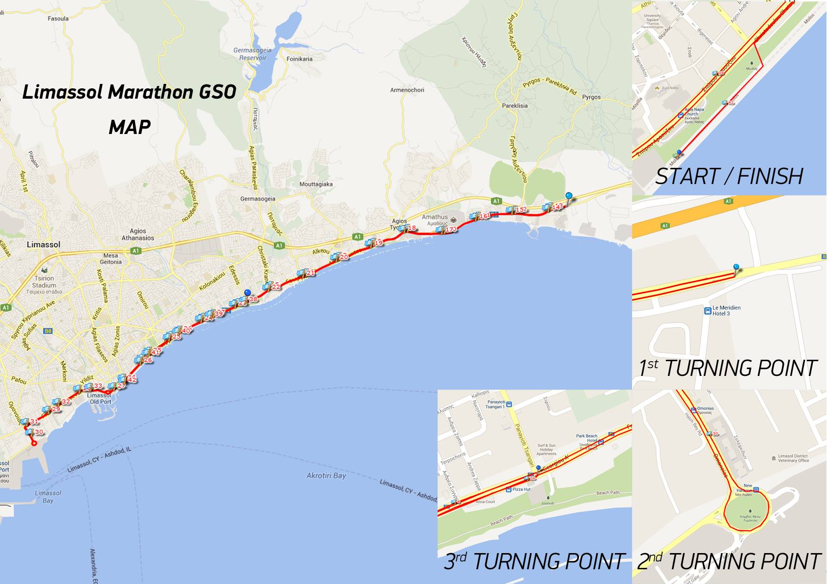Trasa biegu w Limassol (grafika poniżej) jest szybka i łatwa. Na zawodników czekają długie proste i minimalna ilość podbiegów. Większa część maratonu prowadzi wzdłuż wybrzeża, więc można spodziewać się utrudniającego bieg wiatru. Zawodnicy ruszają z centrum miasta. Mijają liczne sklepiki, bary, restauracje kierują się na wschód zmierzając w stronę starożytnego Amathus. Mijają po drodze urokliwe Agios Athanasios i Germasogia, po czym za Agios Tychonas zawracają, by finiszować ponownie w Limassol.