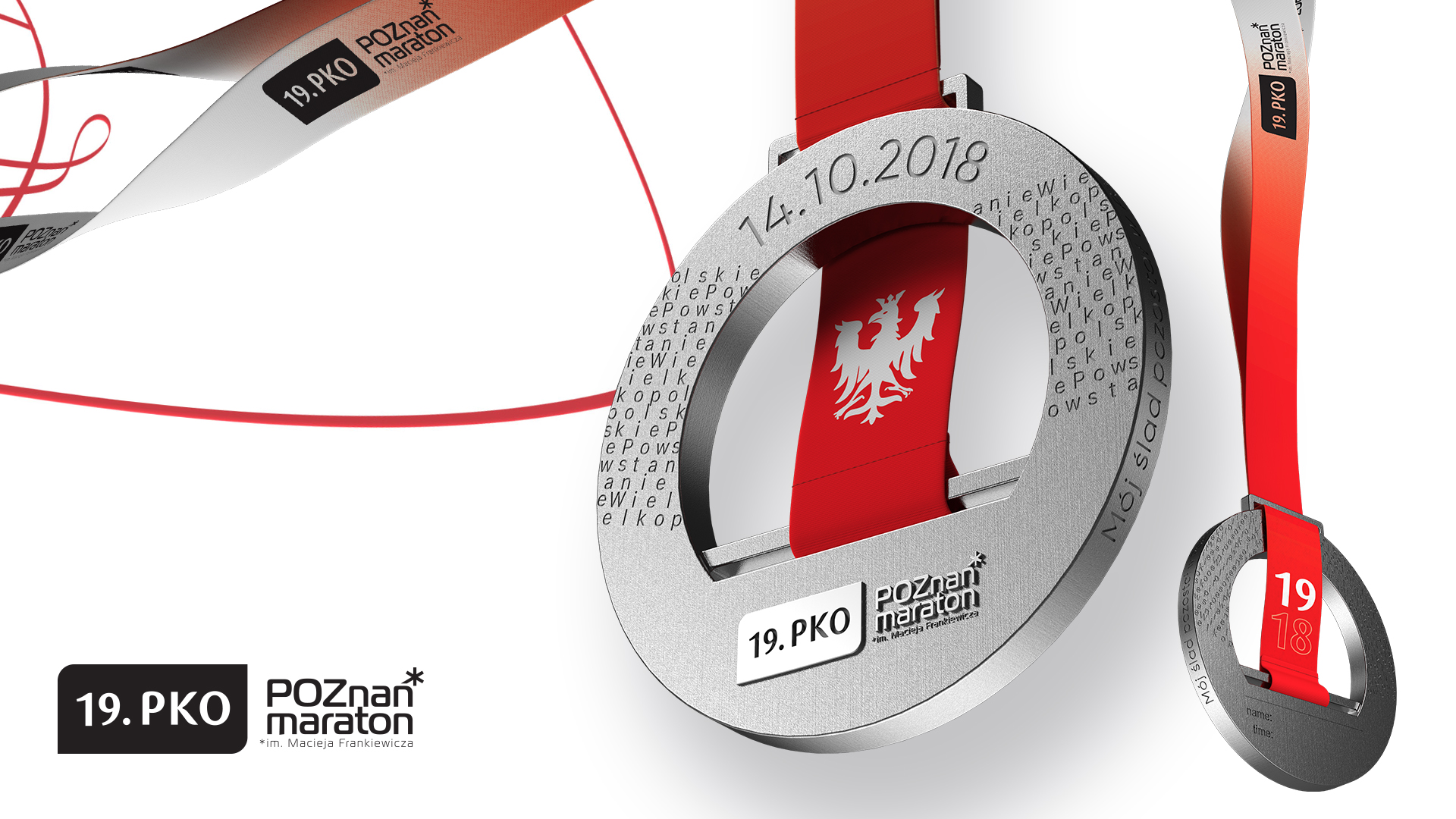 Okrągły o średnicy 7,5 centymetra, grubości 7 milimetrów i wadze 160 gram, z czerwoną wstążką opatrzoną wizerunkiem orła – tak w skrócie można opisać medal 19. PKO Poznań Maratonu im. Macieja Frankiewicza.