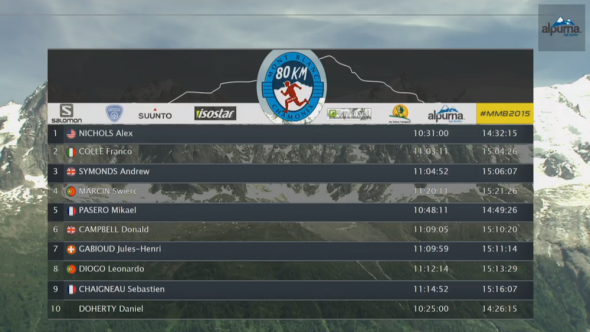 W Francji zwyciężył z czasem 10 godzin i 31 minut jeden z faworytów imprezy Amerykanin Alex Nichols, który w przeszłości triumfował m.in. w American Discovery Trail Marathonie czy w Barr Trail Mountain Race.