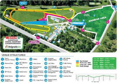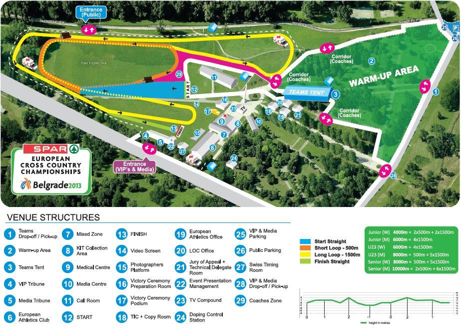 Bazą imprezy będą Hyatt Regency Belgrade Hotel oraz Tulip Inn Hotel Belgrade. Rywalizacja toczyć się będzie na pięćset i tysiącpięćsetmetrowych pętlach o płaskim profilu. Pierwsze biegi startują o godz. 9:45.