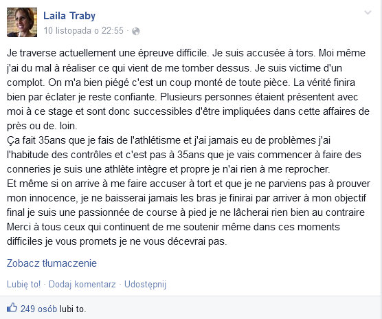 Francuzka Laili Traby, brązowa medalistka Mistrzostw Europy z Zurychu w biegu na 10 000m została oskarżona o stosowanie dopingu. W pokoju hotelowym zawodniczki znaleziono erytropoetynę (EPO). Biegaczka została poddana testowi antydopingowemu.