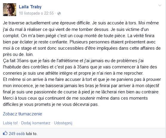 W sierpniu tego roku w Zurychu Laili Traby zajęła trzecie miejsce w biegu na 10 000m, czasem 32:26,03 ustanawiając jednocześnie rekord życiowy. Złoto zdobyła wtedy Brytyjka Joanne Pavey a srebro inna z Francuzek - Clémence Calvin. Przypomnijmy, że w biegu finałowym biegła także Karolina Jarzyńska (13. miejsce).