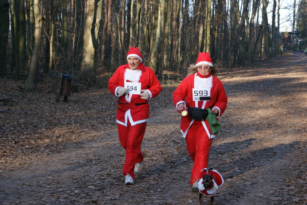 Wspomniałem o tłumie „wojowników ninja”, było też na trasie mnóstwo „świętych Mikołajów”. To akurat nie dziwi, taki w końcu to był bieg. Organizatorzy wyróżnili nawet specjalnymi upominkami tych, co przebrali się w sposób najbardziej efektowny. Pierwszą nagrodę w tej kategorii otrzymało małżeństwo z pupilkiem, czyli Dorota i Marek Suknarowscy z pieskiem. Wszyscy w gustownych, czerwonych wdziankach w dystyngowanym tempie przetruchtali „dychę” w półtorej godziny.