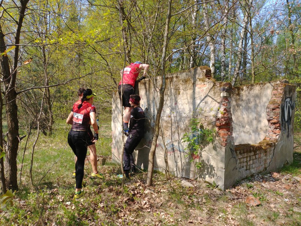 Ze względu na start interwałowy, zostaję przydzielony do ostatniej grupy. Pierwszy z niej przeskakuję przez okno wypalonego domku i dobiegam na rzutnię, gdzie trafiam kamieniem do opony tylko raz na trzy próby. Przytulam dwie karne rundy. Po ich pokonaniu biegnę za własnoręcznie ustawionymi strzałkami i szarfami. Na stromych wałach ziemnych trochę zyskuję i stopniowo doganiam następną grupkę. Łapię ich przed Ruinami Strachu. Pilnująca przeszkody Aga robi nam kilka zdjęć. Na pierwszej ściance pomagam jednemu współzawodnikowi, przeskakuję drugą i uciekam, jednak Kuba z Watahy siedzi mi cały czas na ogonie.