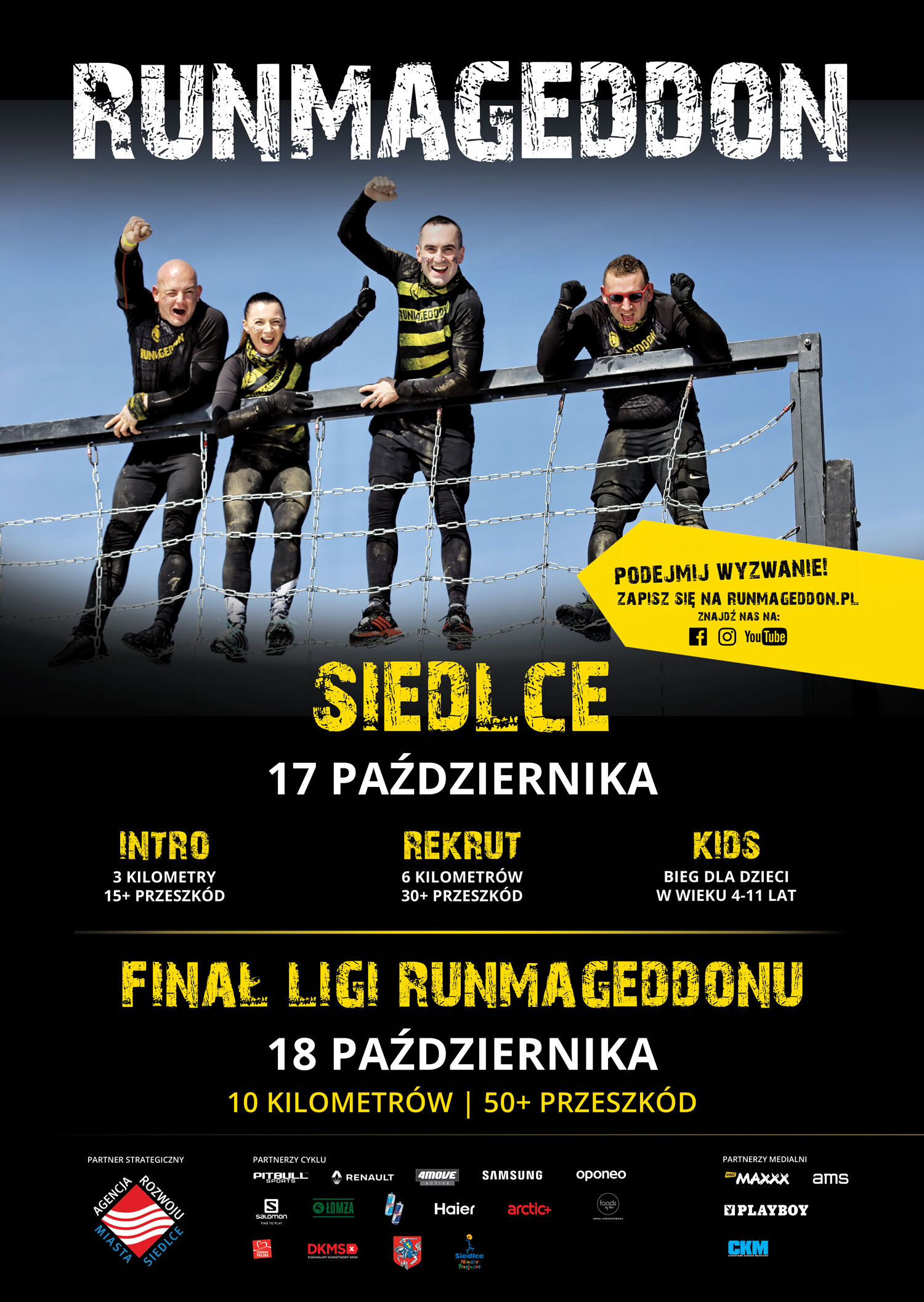W dniach 17-18 listopada br. w Siedlcach odbędzie się ostatni w tym sezonie Runmageddon, podczas którego mieszkańcy Siedlec i okolic będą mogli spróbować swoich sił w najpopularniejszym w Polsce cyklu biegów z przeszkodami. Na starcie będą mogły stanąć dzieci w wieku 4-11 lat oraz dorośli. Dodatkowo, w Siedlcach rozegrany zostanie Finał Ligi Runmageddonu oraz III Mistrzostwa Polski Biegów Przeszkodowych.