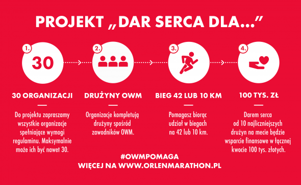 – Akcja charytatywna „Dar serca dla….” zastąpi w tym roku znany mieszkańcom Warszawy od lat sobotni marszobieg. Do udziału w niej zapraszamy z jednej strony organizacje pożytku publicznego, z drugiej, uczestników Orlen Warsaw Marathon, dla których ukończenie biegu będzie nie tylko powodem do dumy, ale może okazać się również realnym wsparciem dla wskazanych przez nich organizacji – mówi Rafał Pasieka, Dyrektor Wykonawczy ds. Marketingu PKN Orlen.