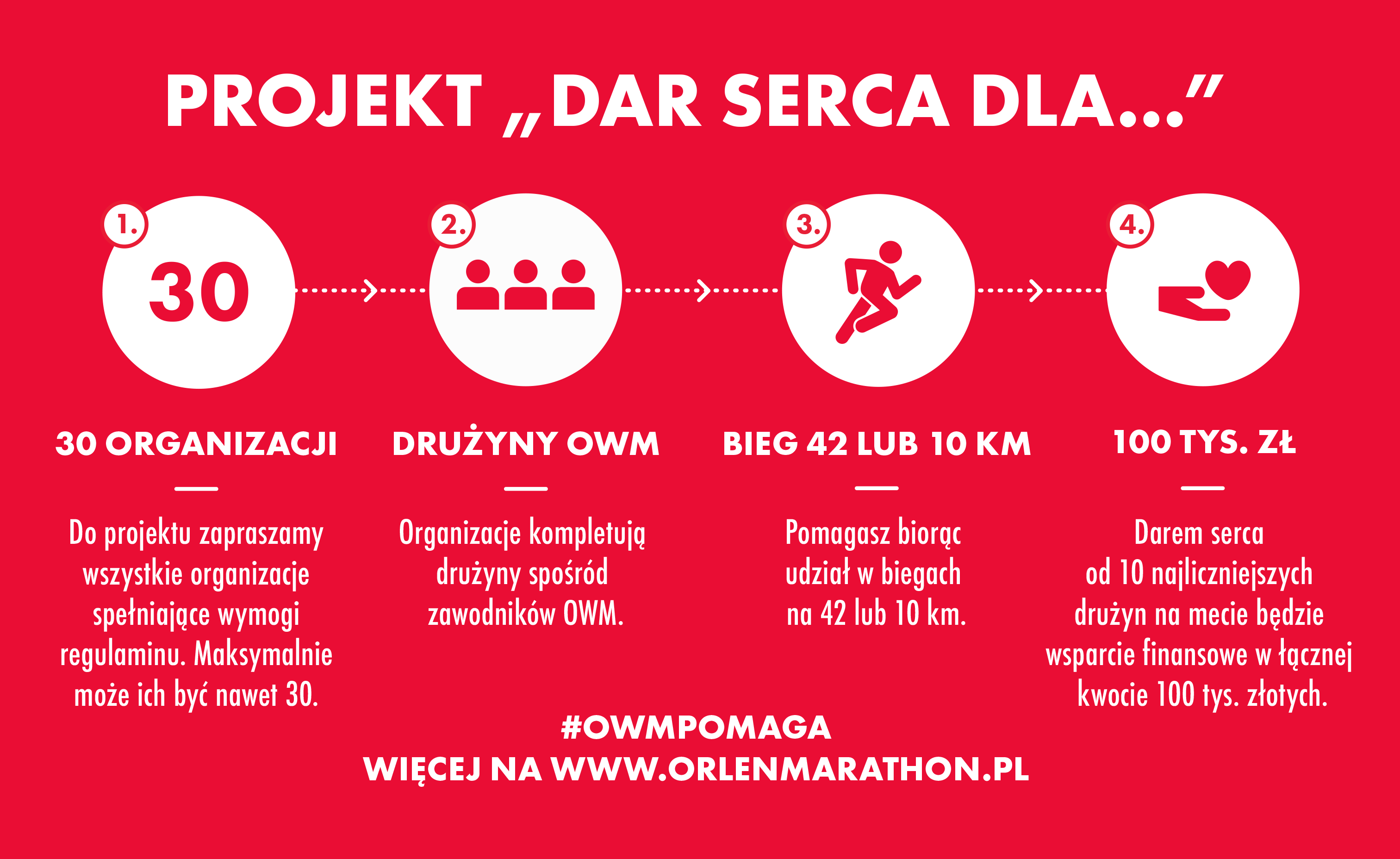 W akcji mogą wziąć udział wszyscy zawodnicy ORLEN Warsaw Marathon i biegu OSHEE 10 km. Jak się zapisać i podarować swój dar serca potrzebującym? Wystarczy wybrać jeden cel powiązany z organizacją, stając się częścią jednej drużyny. Pełna lista podmiotów pożytku publicznego zakwalifikowanych do projektu zostanie ogłoszona 7 kwietnia br. na stronie www.orlenmarathon.pl.