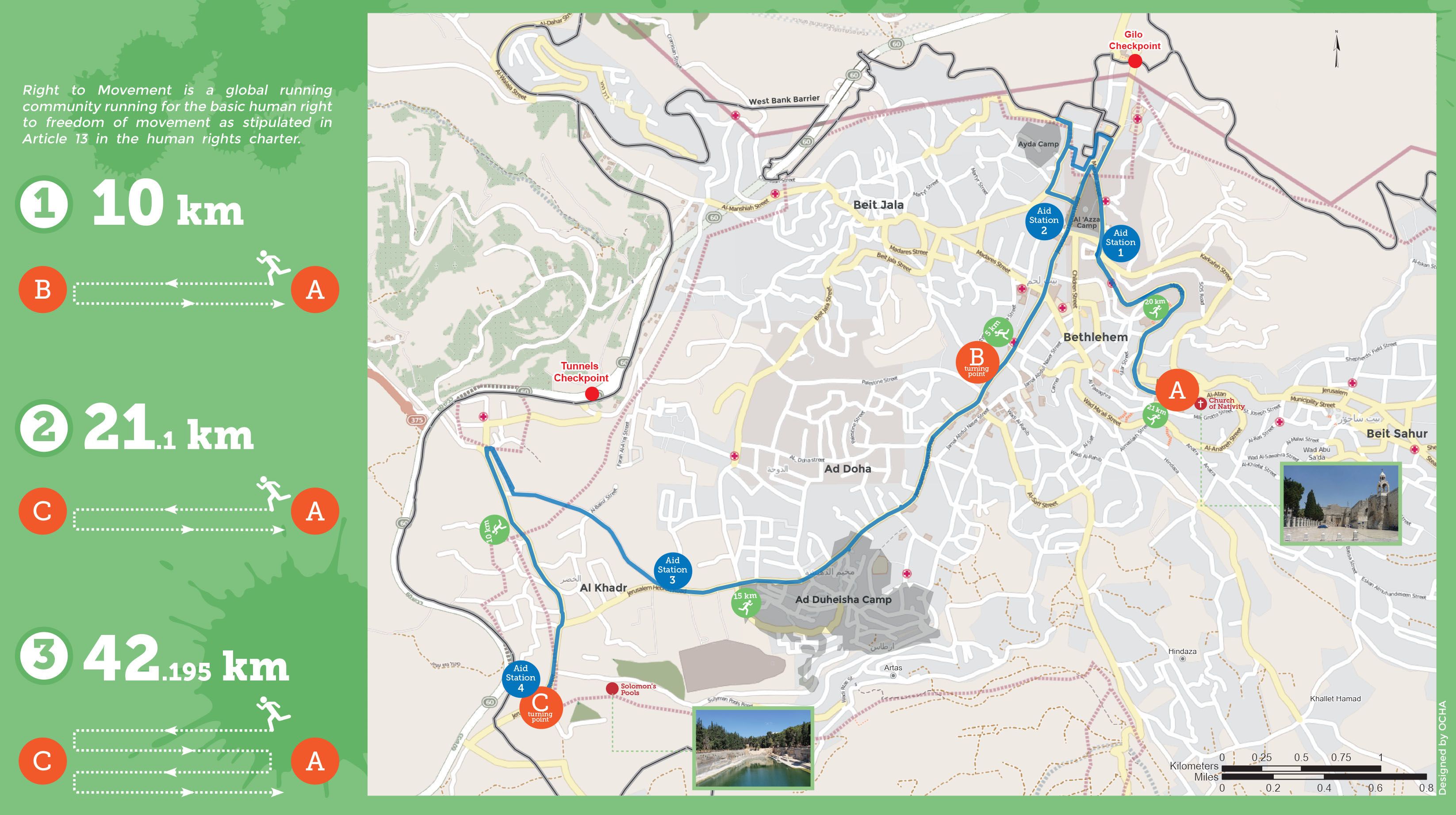 W ramach imprezy rozgrywany jest też bieg na 10 km i półmaraton. Trasa jest wymagająca i prowadził przez centrum miasta, okolice Bazyliki Narodzenia Pańskiego, obóz dla uchodźców oraz wzdłuż izraelskiego muru. Organizatorzy zapewniają, że żaden inny maraton na świecie nie jest rozgrywany w takiej scenerii.