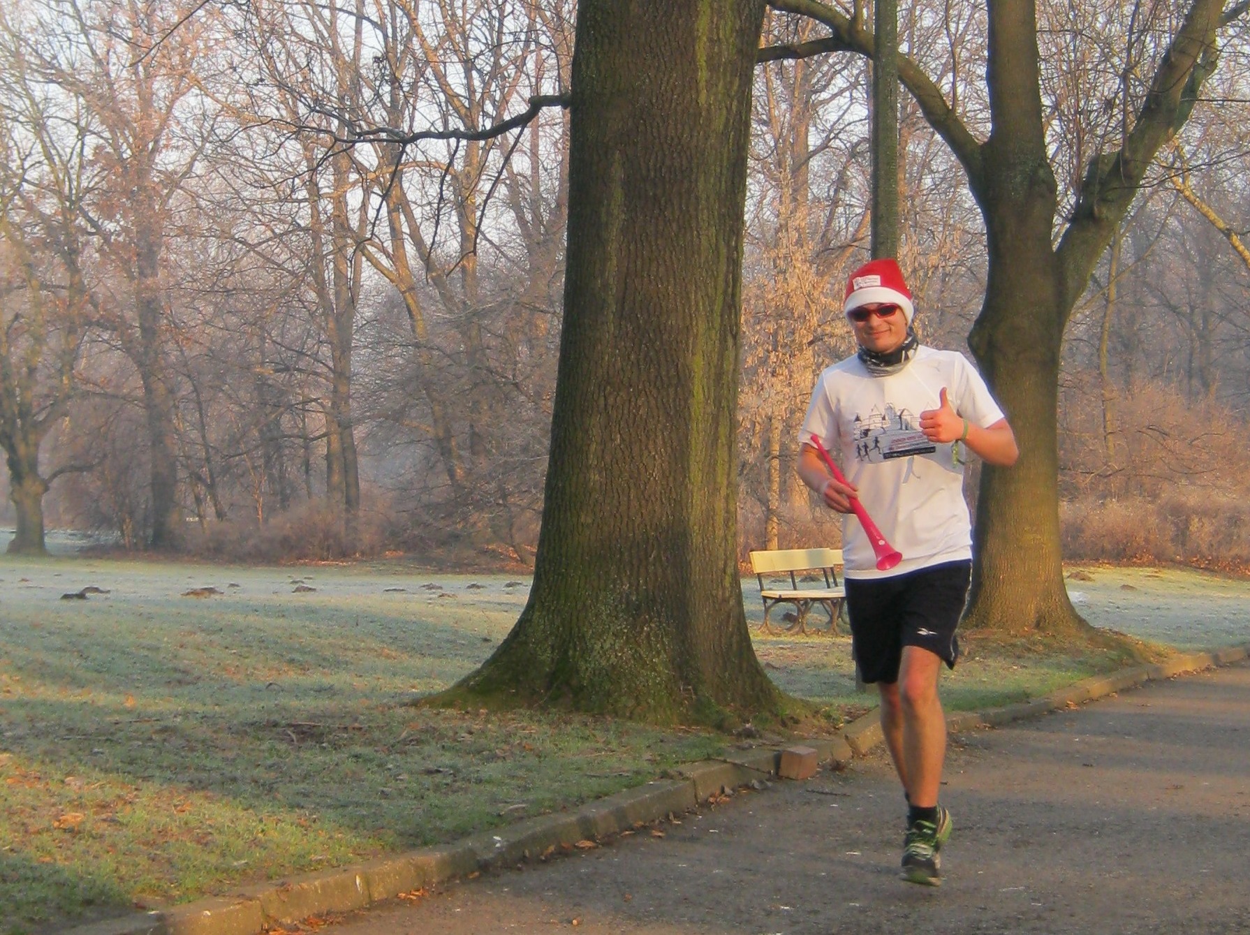 Jak sam znalazłbym ich w tym wielkim parku i poznał, że uczestniczą w „zawodach”? Pierwszy mija nas przebrany za kibica reprezentacji Polski mężczyzna. Albo on ma talent na miarę Kenenisa Bekele albo pomylił trasę. Okazuje się, że bliżej naszym podejrzeniom do tej drugiej opcji. Czekamy więc rozmawiając. – Pomysłem na bieg jest kończący się rok i sama satysfakcja z tego, żebyśmy razem spotkali się na mecie – mówi Piotr Kober organizator biegu. – Nie smuci mnie frekwencja. Cieszy mnie, to że tym kilku osobom chciało się pobiec – dodaje organizator. Bieg powinien zakończyć się o godzinie 10.
