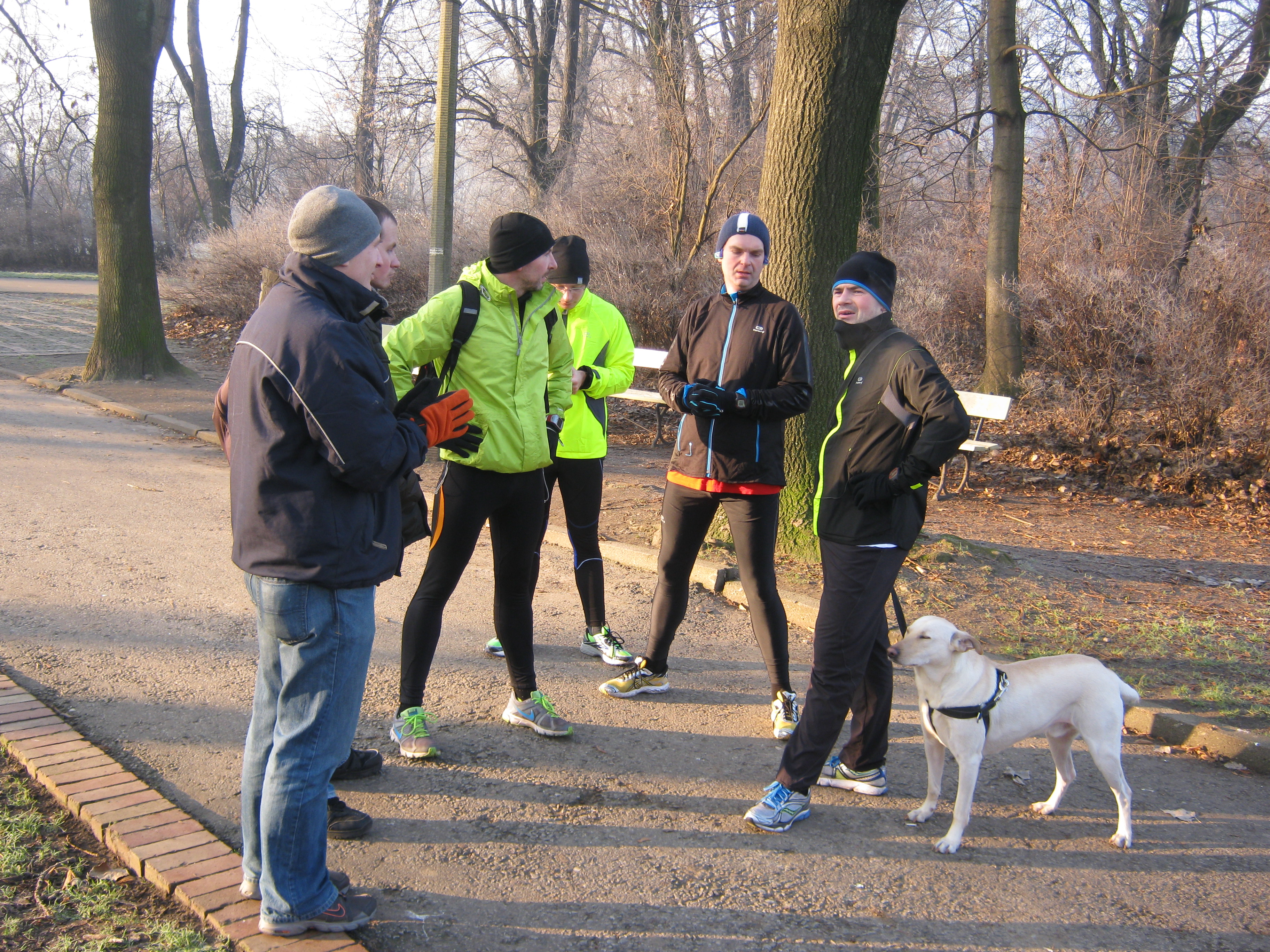 W końcu na długiej prostej pojawiają się trzej zawodnicy biegnący obok siebie, tempo mają majestatyczne. Tuż za nimi kolega z psem. Tak jak planowano o godzinie 10 pokonują metę (może chwilę przed). Rozmawiamy o planach na przyszły rok, czekając na ostatniego z uczestników czyli kibica biało- czerwonych. W końcu i on trafia na metę. Wszyscy składamy sobie najlepsze życzenia w Nowym Roku.