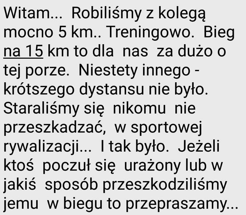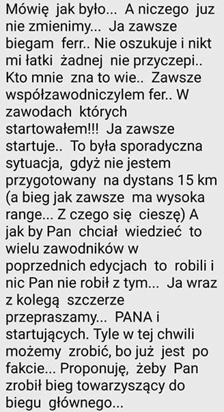 Obaj przyznali się do błędu i „szczerze” przeprosili organizatora i startujących, choć nie zabrakło uszczypliwości: „A jak by Pan chciał wiedzieć to wielu zawodników w poprzednich edycjach to robili i nic Pan nie robił z tym...” (pisownia oryginalna).