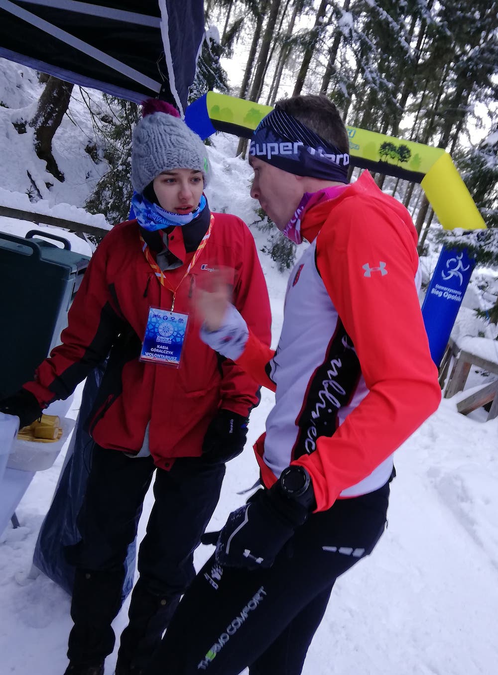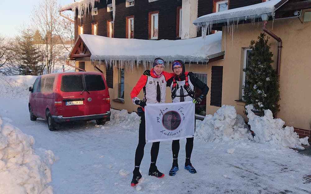 Ubrałem się w większości sprzęt, który będzie mi towarzyszył na Bajkale. Najbardziej zależało mi na sprawdzeniu nowych butów z kolcami, kurtki oraz termo odzieży i rękawiczek. Zabrałem z sobą pas z bidonem, a do kieszeni wsadziłem wymaganą w regulaminie folie NRC i telefon. Zrobiłem sobie fotkę z Kamilem i poszedłem na rozgrzewkę.
