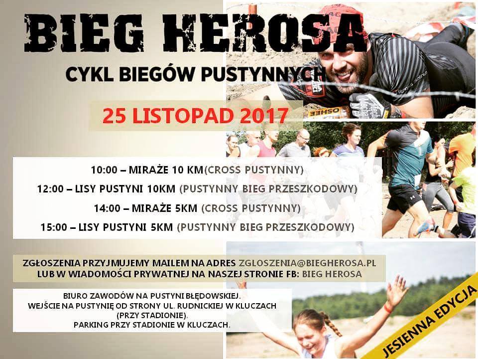 Jesienna odsłona Biegu Herosa odbędzie się 25 listopada na Pustyni Błędowskiej, od strony miejscowości Klucze. Zapisy są dostępne na stronie: www.biegherosa.pl.