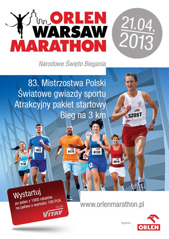 Pierwszy ORLEN Warsaw Marathon pobiegnie ulicami Warszawy 21 kwietnia 2013 r. W trakcie imprezy rozegrane zostaną 83. Mistrzostwa Polski w kategorii mężczyzn, a swój udział w biegu zapowiedział już najszybszy polski maratończyk Henryk Szost.. Oprócz głównej rywalizacji na 42 km, maraton uatrakcyjni także bieg charytatywny na dystansie 3 km oraz atrakcje dla publiczności.