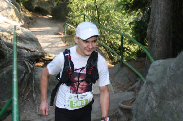 Podejście zacząłem dość agresywnie. Najpierw 3 schody później 2 i znowu 3…I tak wbiegałem na szczyt, popijając często moją miksturę z plecaka. Na 150 metrów przed metą znowu spotykam Darka z Ulą, którzy jeszcze motywują. Na samej drodze na Szczeliniec na schodach nie brakuje już finiszerów. Schodząc kibicują i dodają otuchy.
