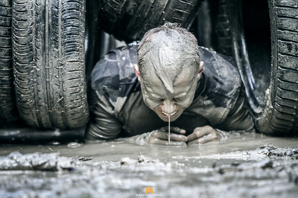 Spacer farmera z oponami. Porodówka, też z opon. Czołganie w błotnej kałuży pod wrednie nisko ułożonymi gałęziami. Muszę zanurzyć usta i nos, by się przecisnąć. Łykam trochę syfu, piach będzie jeszcze długo zgrzytał w zębach. Kwintesencja upodlenia. Wolontariusz robi fajny klimat, pokrzykując na nas niczym kapral.