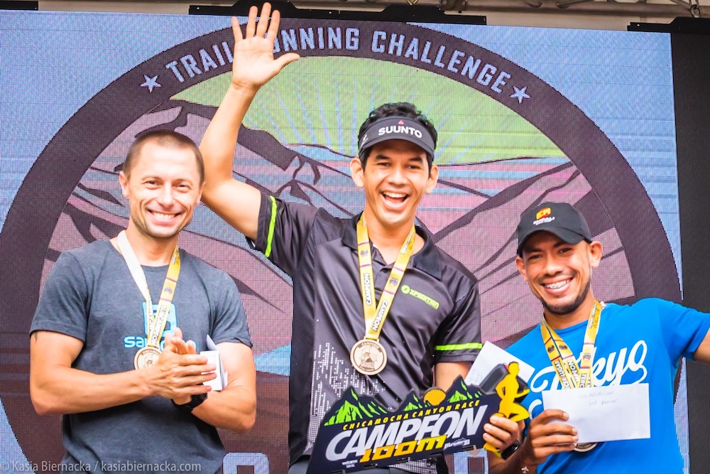 Tak, rzeczywiście koło 50 km objąłem prowadzenie, ale kilkanaście km dalej przy pokonywaniu rzeki, naciągnąłem mięsień czworogłowy, co nieco spowolniło moje tempo. Na jednym z punktów odżywczych dogonił mnie Kolumbijczyk, potem jeszcze odskoczyłem mu na jednym z podejść, ale na zbiegach i odcinkach generalnie biegowych, wiedziałem, że nie będę wstanie z bolącą nogą trzymać jego tempa. I rzeczywiście tak było, z tego co teraz wiem, przewaga Kolumbijczyka delikatnie rosła do końca biegu.